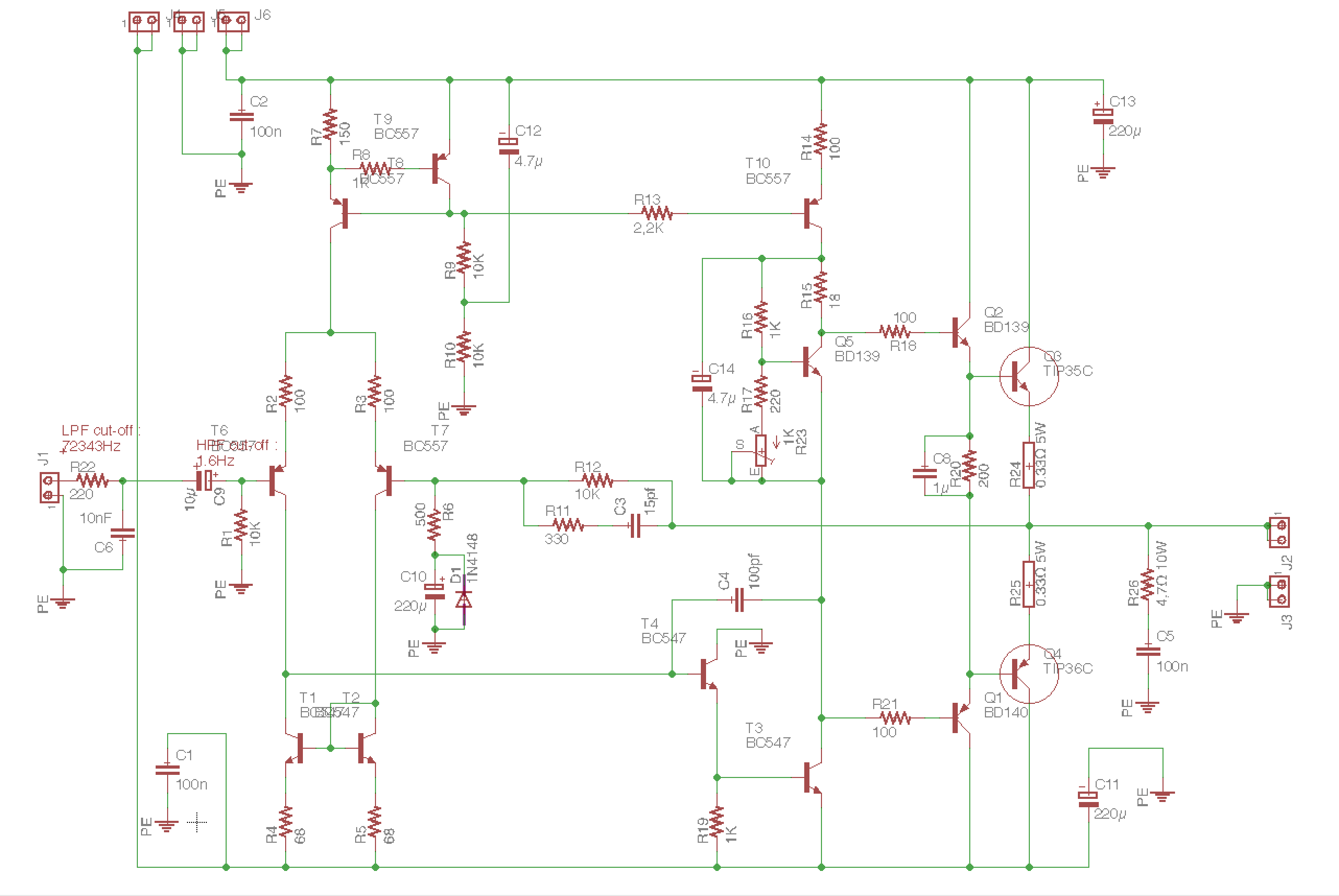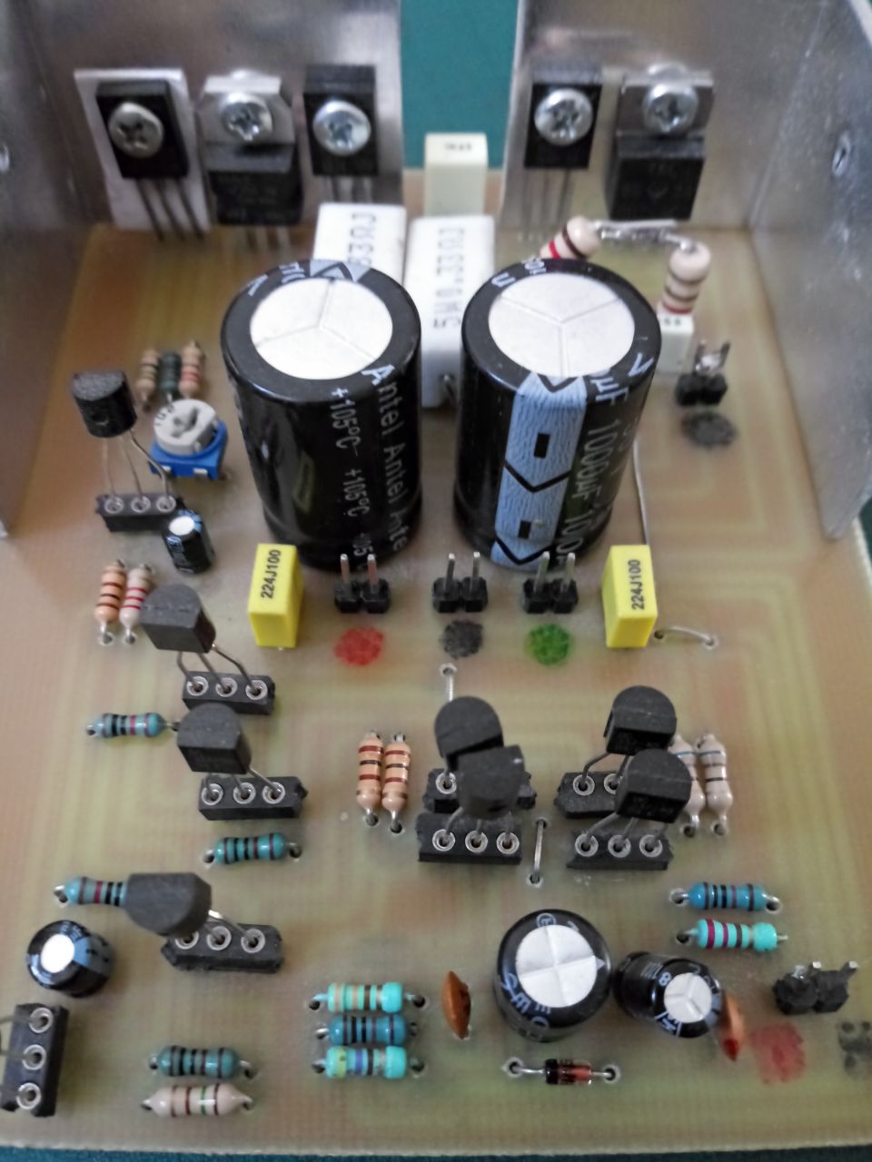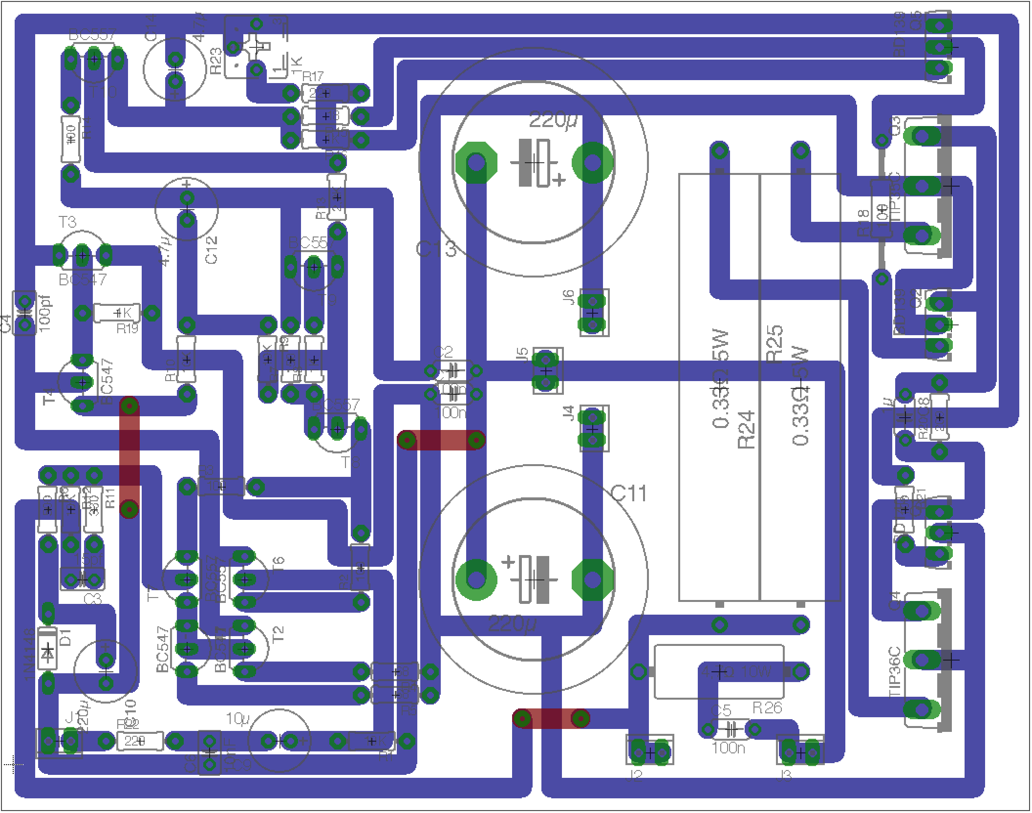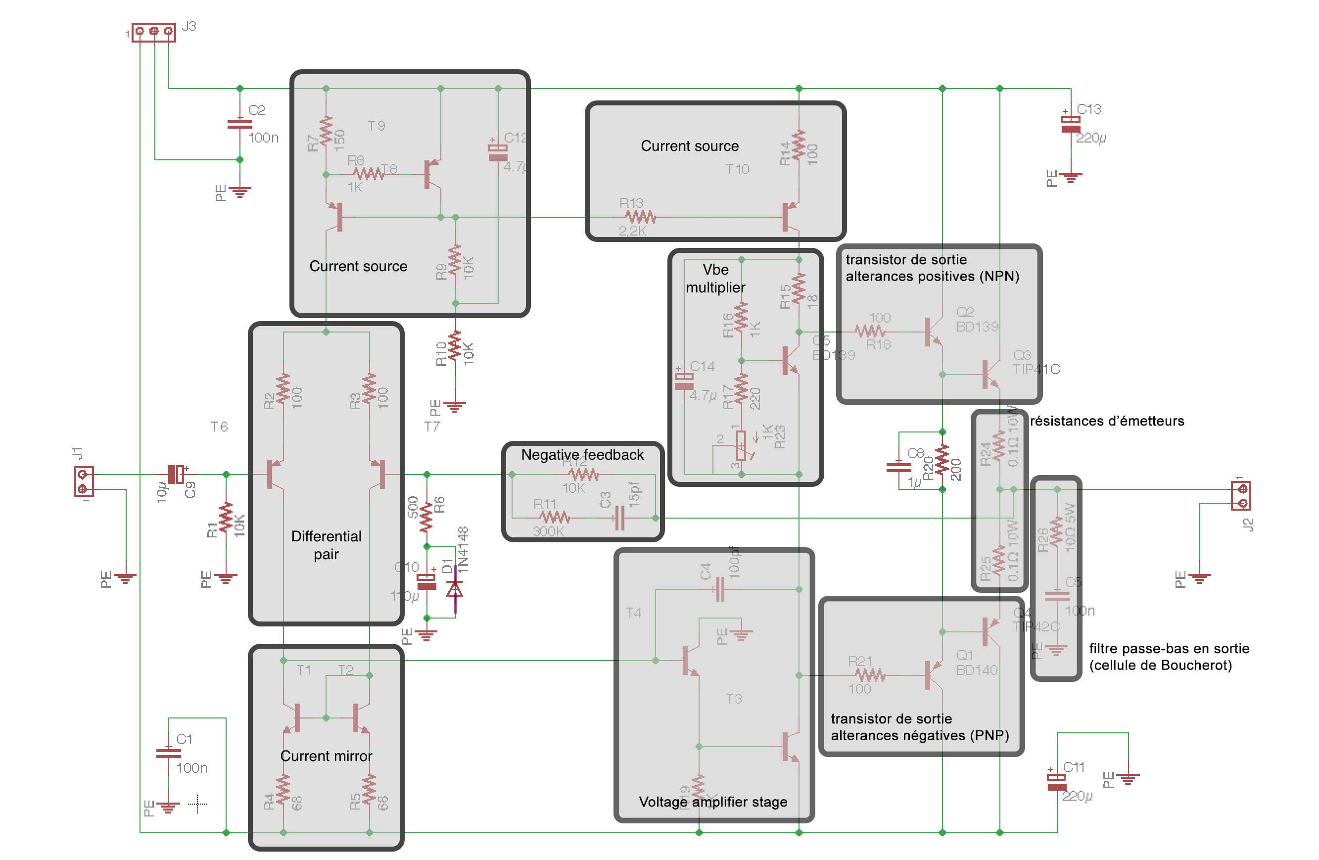 Un effort a été accompli pour bien séparer les parties de puissance et les partie de signaux faibles, limiter les straps, et l'encombrement. Des découplages d'alimentation améliorent cette séparation. Tous les transistors de sortie seront montés sur dissipateur, le transistor du Vbe multiplier également (asservissement en température). Les connecteurs sont renvoyés sur les bords. Les condensateurs de découplage local sont relativement loins des transistors (vieillissement prématuré à cause de la chauffe).