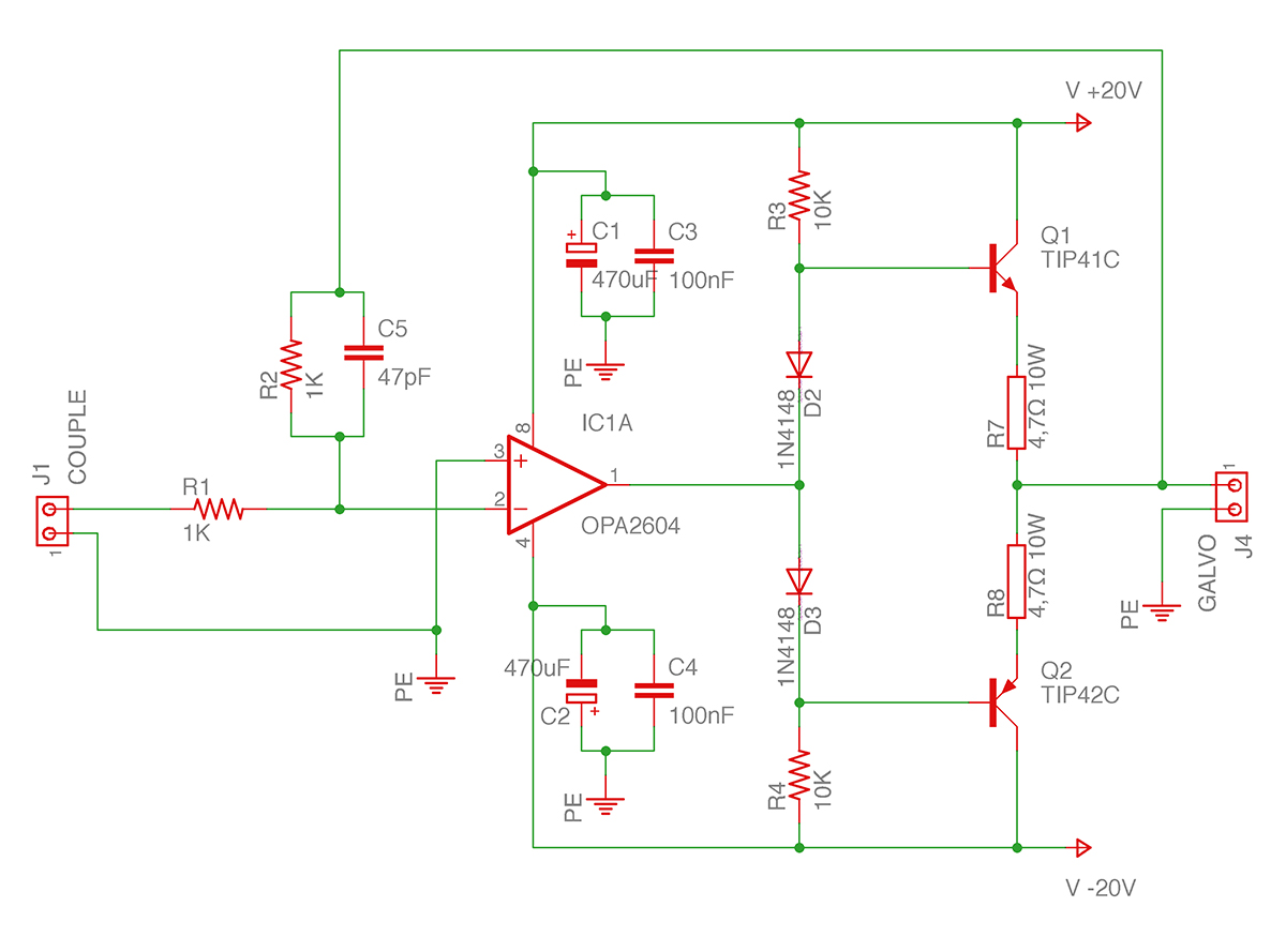 J'ai préféré monter un ampli à transistors plutôt que d'employer un AOP de puissance (type LM675T par exemple). Il n'est sans aucun doute pas parfait mais ma foi il a le mérite de la simplicité, ne demande aucun composant rare ou cher et son fonctionnement est très compréhensible ce qui est important dans ma démarche. Il s'agit d'un ampli DC (c'est à dire dépourvu de condensateurs de liaisons) de classe B "push-pull" assez classique dont voici le schéma (il en faut un pour chaque galvo bien sûr :-) :