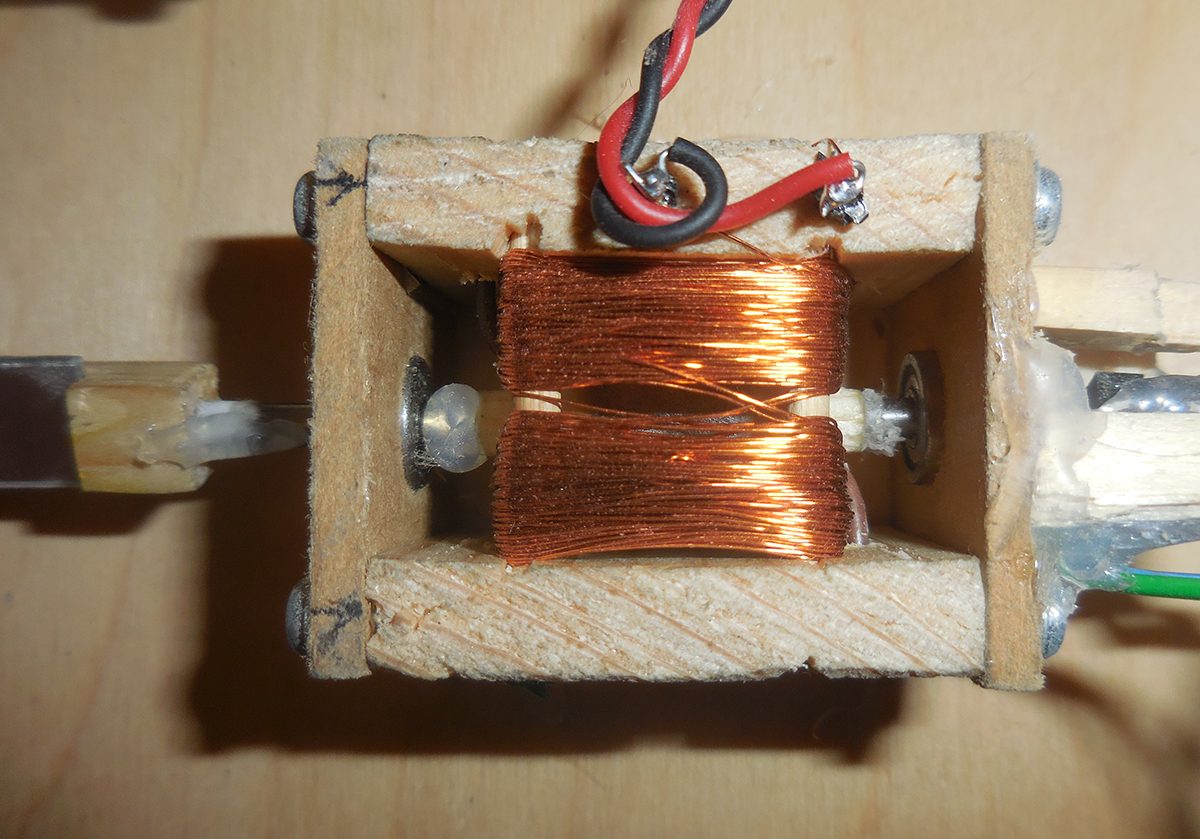 L'arbre traverse le boîtier de part en part, il est soutenu par des roulements à billes. Le miroir est monté à son extrémité gauche, l'aimant est placé en son milieu, et à droite se situe le capteur optique de position angulaire. La bobine encadre l'aimant (elle est scindée en deux pour laisser passer l'arbre). Selon le courant qui la traverse (son intensité, son sens), elle crée un champ magnétique qui imprime un couple sur l'arbre et le force à tourner de manière à aligner les lignes du champ de l'aimant avec celles de la bobine.