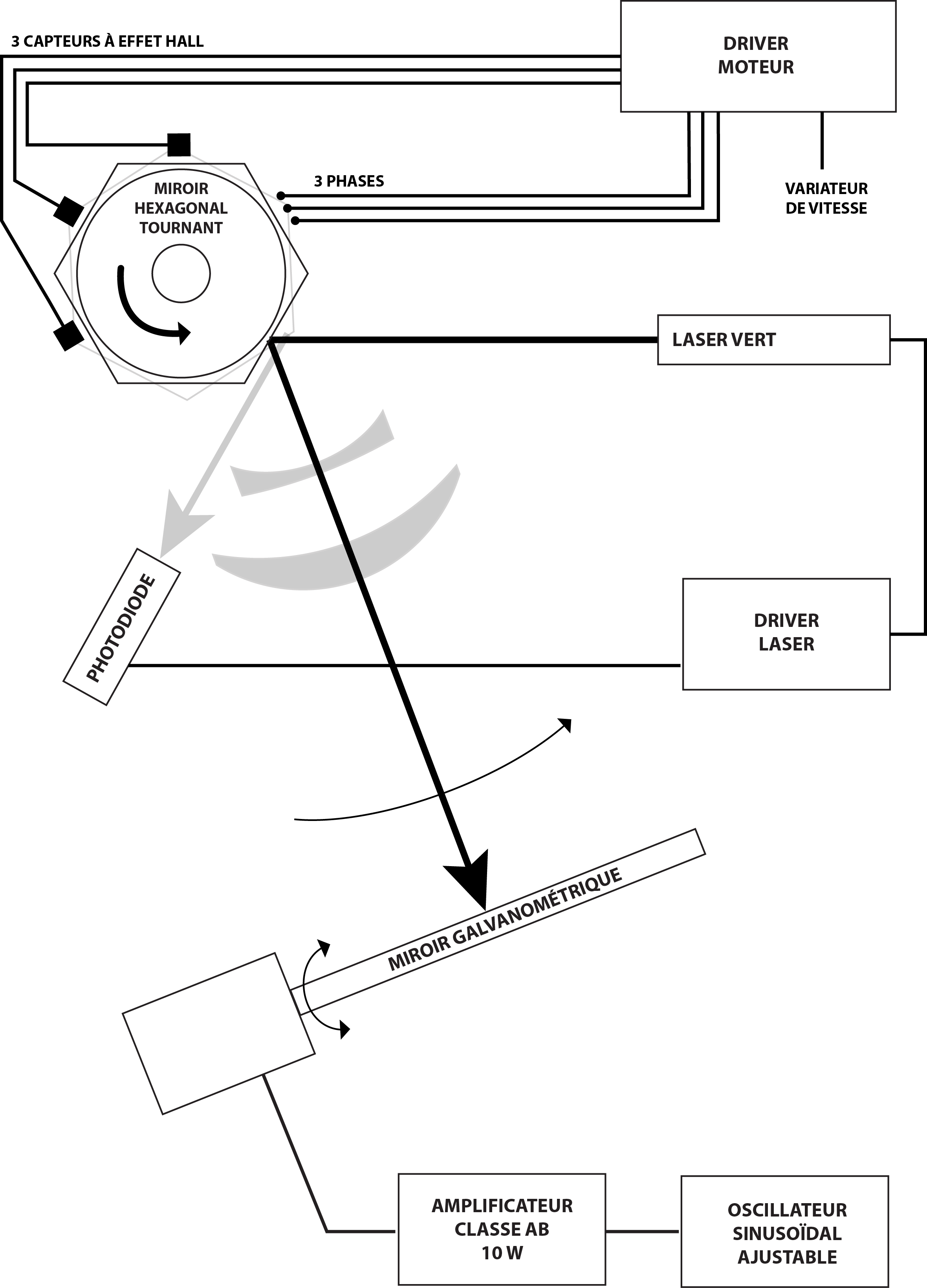 Un faisceau laser est dévié en X et en Y à l'aide deux miroirs orientables contrôlés par un Arduino. Le très brillant spot lumineux se déplace sur un écran et dessine une forme plusieurs fois par seconde, la persistance rétinienne donne l'impression d'un trait continu, une forme, un mot apparaît. Cette technologie de pointage précis d'un laser est utilisée dans le spectacle et dans l'industrie pour la gravure — voire la découpe. (l'appareil pour le son-sur-film, encore lui, n'est pas très éloigné.)