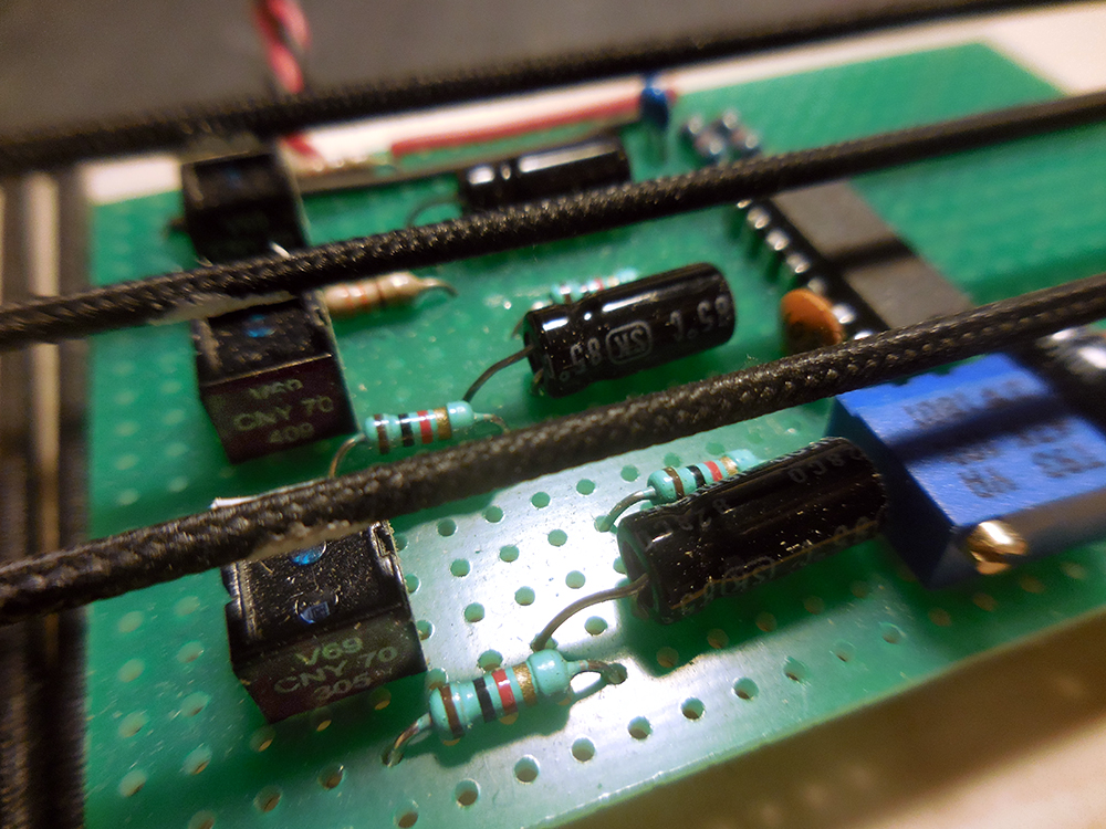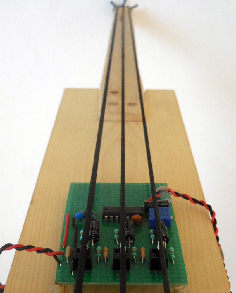 Trois de ces capteurs éclairent et observent chacun les vibrations d'une corde vibrante en caoutchouc. Une tâche de peinture blanche sur la corde améliore la réponse du capteur. Le signal est d'abord débarrassé de sa composante continue par un condensateur puis filtré et amplifié au niveau ligne par un AOP. La basse est alimentée sous 12V par des piles :