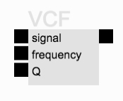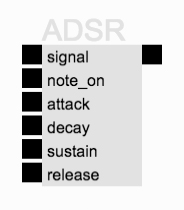 Cet élément contient un VCA et 4 paramètres définissant l'enveloppe du son : durée Attack, durée Decay, valeur Sustain et durée Release. Il prend un signal sonore en entrée et il peut recevoir les tops d'un séquenceur de tops sur son entrée "note_on".