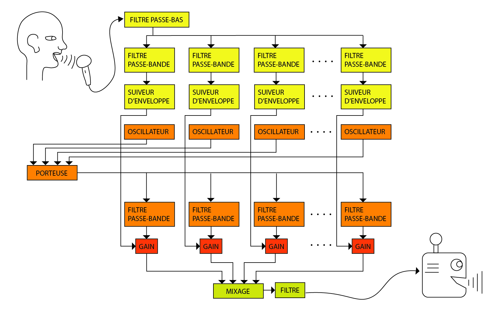 Le signal modulant (la voix) est séparé en un certain nombre de composantes fréquentielles (bandes, 16 ici) par des filtres passe-bande. Le choix de la fréquence centrale de ces filtres est important, tout comme leur sélectivité.