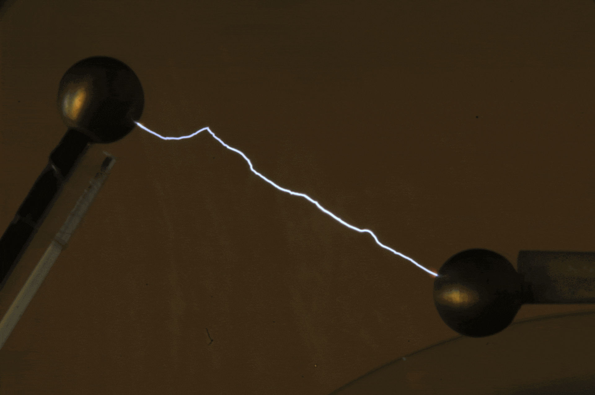 Lorsqu'on actionne la manivelle, les deux condensateurs se chargent à des tensions opposées très élevées. Lorsque la tension entre les deux boules dépasse la tension de claquage de l'air, une étincelle est éclate.