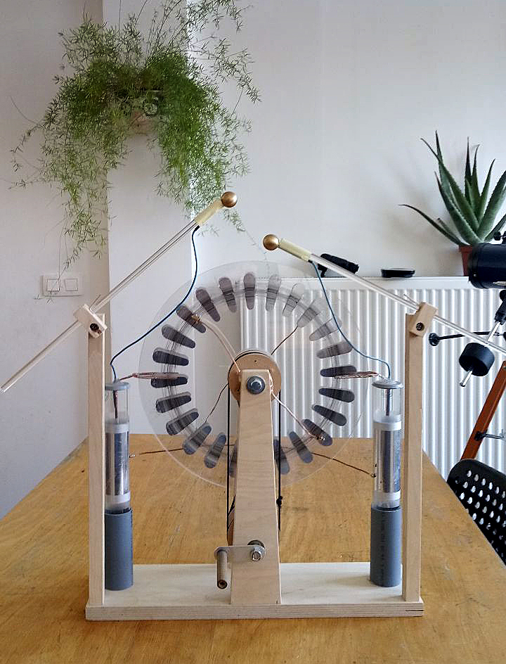 Il s'agit d'une machine électrostatique "à influence". Une explication assez claire est disponible sur cette page ou dans les pages de ce superbe site (qui fait référence je crois).